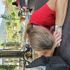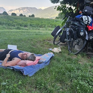 Phil has been a fantastic narrator of our journey and I have just a few words to add. He has excelled at things that aren’t obvious from this story. These include the insight that he would want his phone instantaneously to hand to take photos. Solution- glue strong magnets to the top of the handle bar bag which allowed you to have your phone on top. Most of the photos on this website were taken as we were rolling. He rarely stopped to take them. All the coding for this site has been done enroute. He has taken care of the detailed route planning (Garmin and Google maps), ensured all our phones and navigation devices were charged and connected with data and setting up camp each evening or tracking down accommodation. What have I been doing whilst he’s done all this and crafted his blog you may ask. Sleeping or lying horizontal somewhere. Turns out he’s got photographic evidence of that too! Here’s to my wonderful, loving and entertaining husband who never once on this trip has left me behind. His energy, openness and delight in the world shine out from what he’s written and those we’ve met have responded with such warmth. I couldn’t have made it without him. Ali