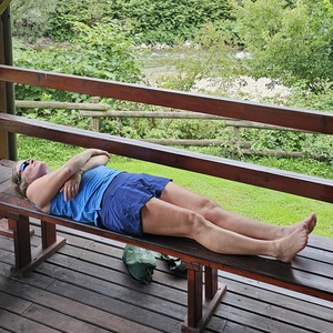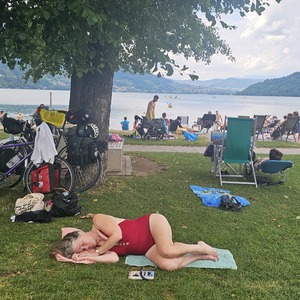 So far all our camp spots have been well away from any homes and onlookers. Last night that proved difficult. Right after our last town comes a beautiful and narrow valley. Lovely for cycling, less good for tents. Only few flat patches and these are either rocky or full of fly-tipped waste. Not so nice. We almost settle for the rocky type, when a new idea occurs to us. Something we haven’t done before on this trip. Daring and potentially rewarding: ask a local if it is OK to pitch our tent in their garden. We push our bikes up a steep driveway. We are prepared. I pulled out a picture of our tent, so that we can immediately show what a tiny tent it is. And we have ChatGPT on the ready for translation. With all this in hand, I press the door bell. Nothing. Surely, someone must be here. There is a car next to the house. We cautiously look around. A man in his 60s emerges from a field, having just tended his plants. He wears a floppy hat and a friendly wide smile. Yet again, it is German (rather than ChatGPT) that bails us out. He has a daughter in Passau and understands what we are asking. “Warte” - he walks off at a gentle pace to a neighbouring building. After a few minutes he returns. “Natürlich”. He points at the larger garden of his neighbour, whom he just spoke to. That is a massive relief. Soft, level grass, with proper permission is a good deal better than roughing it on the rocky patch by the road. Once we set up our tent the lady comes to visit, with a cucumber as a gift. Little does she know how much they have already gifted us. A good night sleep.